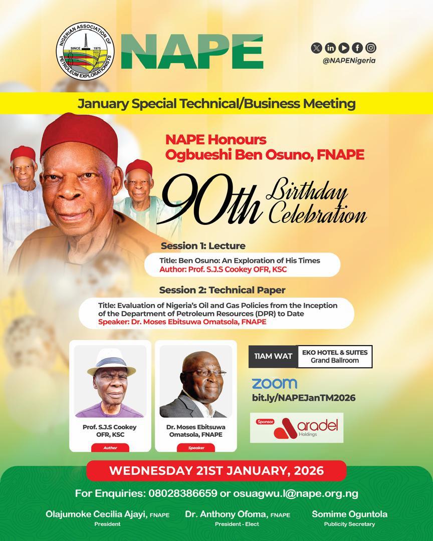 The Nigerian Association of Petroleum Explorationists (NAPE) is honoured to invite you to its January Special Technical/Business Meeting, which will also commemorate a historic milestone—the 90th Birthday celebration of Ogbueshi Ben Osuno, FNAPE.
